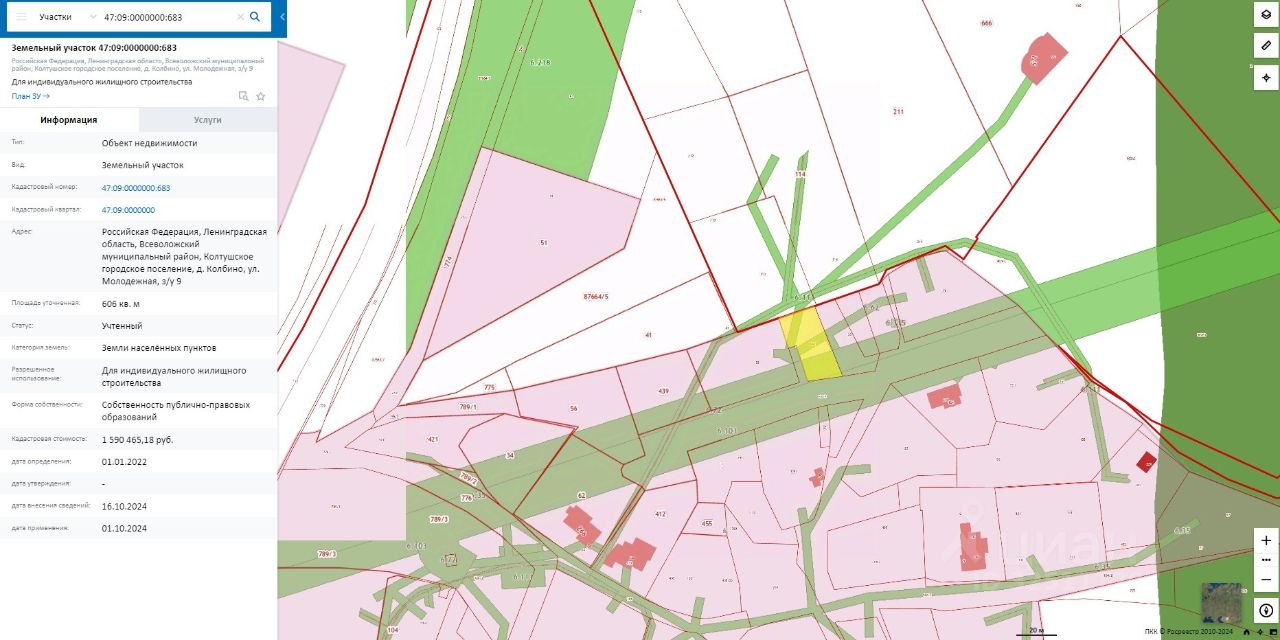Земельный участок из земель, находящихся в собственности Колтушского городского поселения, площадью 606 кв.м, кадастровый номер: 47:09:0000000:683, местоположение: Российская Федерация, Ленинградская область, Всеволожский муниципальный район, Колтушское городское поселение, д. Колбино, ул. Молодежная, з/у 9. Категория земель: земли населенных пунктов; Разрешенное использование: для индивидуального жилищного строительства; Ограничения (обременения): в соответствии со сведениями Единого государственного реестра недвижимости. Земельный участок расположен в границах территории Достопримечательного места, определенных приказом Минкультуры России от 20.02.2024 312 "О включении выявленного объекта культурного наследия "Научный городок физиолога И.П. Павлова на Колтушской возвышенности и Колтушское шоссе (часть)", вследствие чего возможны ограничения строительства в соответствии с требованиями, установленными статьей 5.1 Федерального закона от 25.06.2002 73-ФЗ