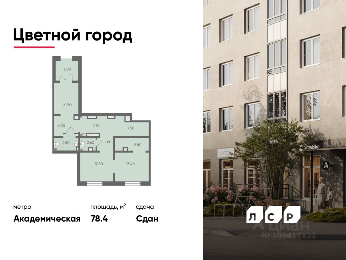 Продается помещение свободного назначения 78.40 кв. м в жилом комплексе комфорт-класса "Цветной город" в Красногвардейском районе.