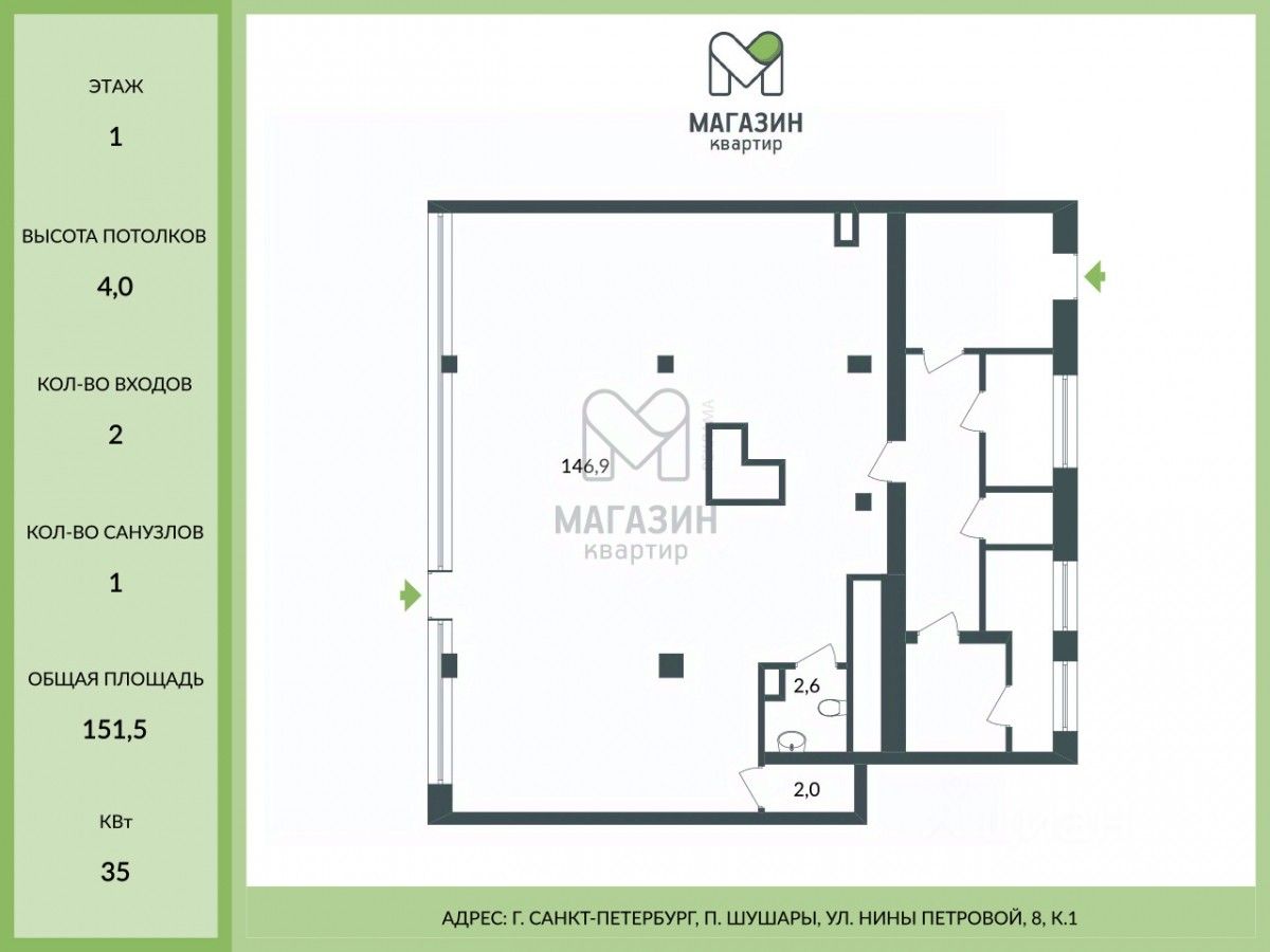 Помещение двухстороннее. Мощность электричества увеличена до 35 кВт.
