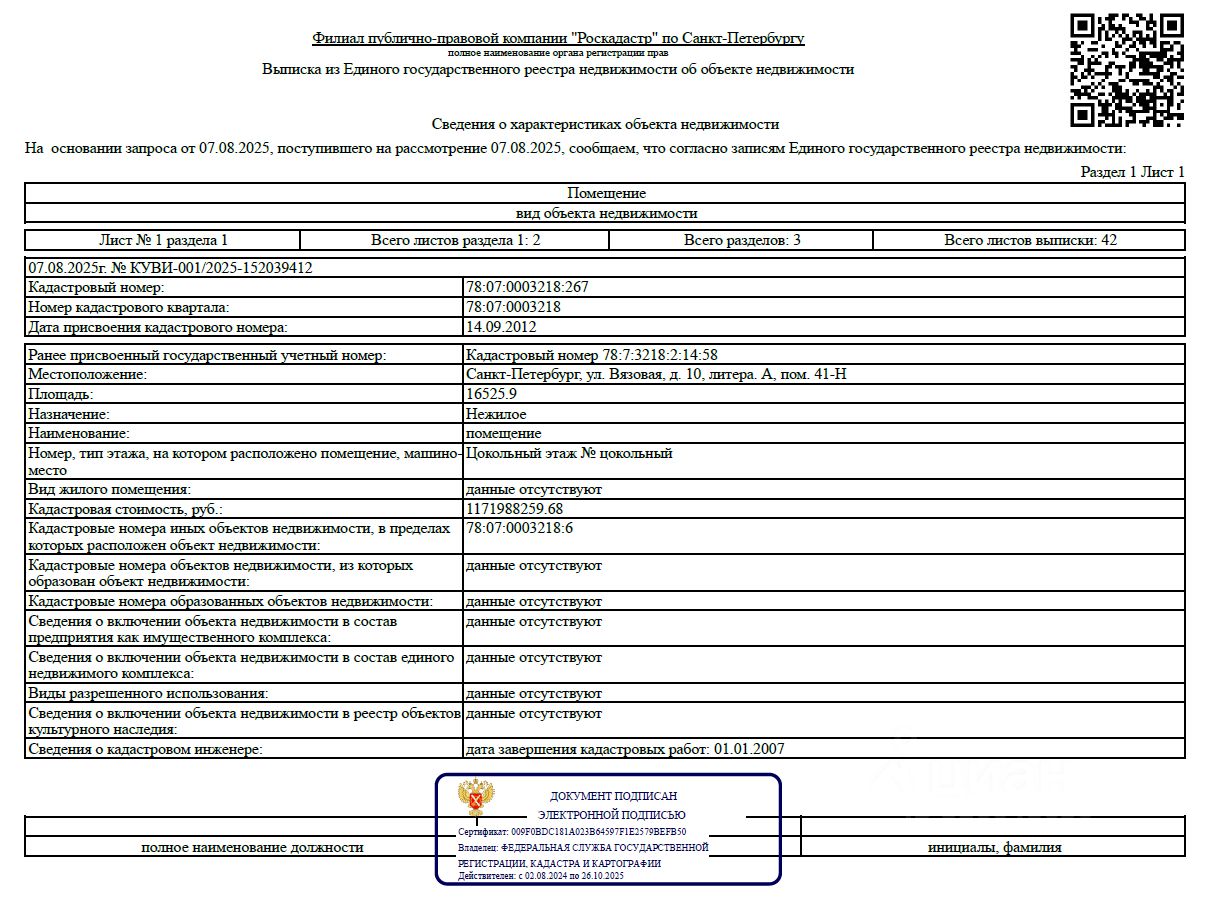Лот1 Подвергнутое аресту СОСП ГМУ по и/п 68846/24/98047-ИП и принадлежащее должнику ООО ЕВРОСТРОЙ арестованное имущество: 504/84000 долей в нежилом помещении общ.пл. 16525,9 кв.м. кадастровый 78:07:0003218:267, расположенная по адресу: Санкт-Петербург, ул.Вязовая, д. 10, лит А, пом 41-Н. Стоимость указана без учета НДС в размере 22 %. По результатам аукциона НДС подлежит обязательной оплате победителем торгов от продажной стоимости.
