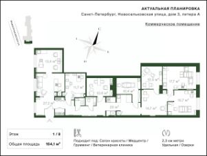 Площадь 164.1 м2 и расположение окон на две стороны создают комфортные условия для салона красоты, медицинского центра или студии груминга.