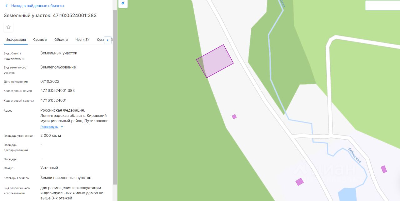 Площадью 2000 кв.м., кадастровый номер 47:16:0524001:383, разрешенное использование: для размещения и эксплуатации индивидуальных жилых домов не выше 3-х этажей.