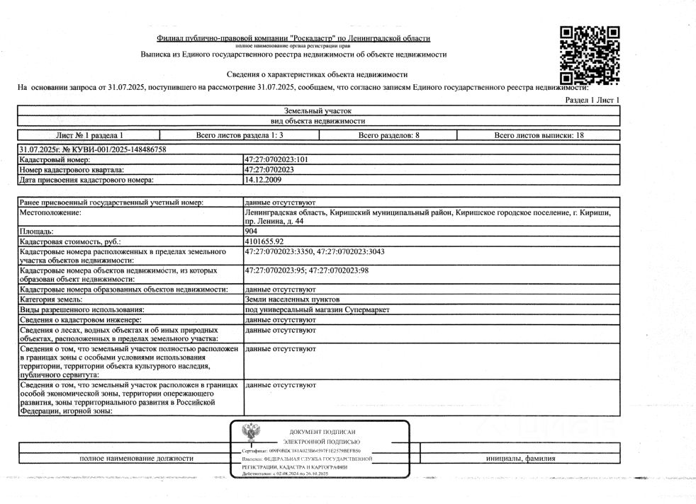 Лот2(повторные) Подвергнутое аресту Тосненского РОСП по и/п 103370/25/47025-ИП и принадлежащее должнику ООО "ПИРАМИДА" заложенное имущество: 113/904 долей земельного участка общ.пл. 904 кв.м. кадастровый 47:27:0702023:101, расположенный по адресу: ЛО, Киришский район, г. Кириши, пр. Ленина, д. 44.