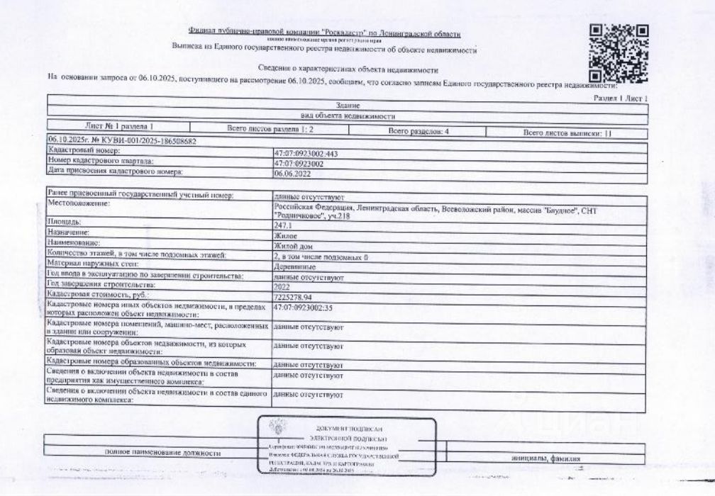 Лот5 Подвергнутое аресту Всеволожским РОСП по и/п 521628/25/47021-ИП и принадлежащее должнику Колбасовой П.Д. заложенное имущество: земельный участок общ.пл. 962 кв.м. кадастровый 47:07:0923002:35 и жилой дом общ.пл. 247,1 кв.м. кадастровый 47:07:0923002:443, расположенные по адресу: ЛО, Всеволожский район, массив Блудное, СНТ Родничковое, уч. 218