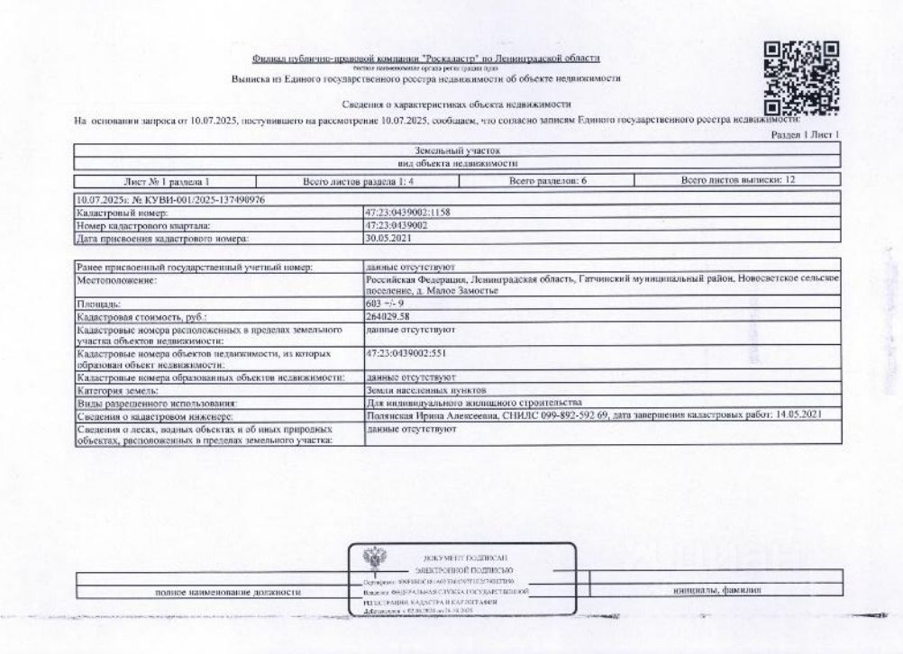 Лот8 Подвергнутое аресту Гатчинским РОСП по и/п 264990/25/47023-ИП и принадлежащее должнику Кулиеву М.М.о заложенное имущество: земельный участок общ.пл. 603 кв.м. кадастровый 47:23:0439002:1158, расположенный по адресу: ЛО, Гатчинский район, д. Малое Замостье.