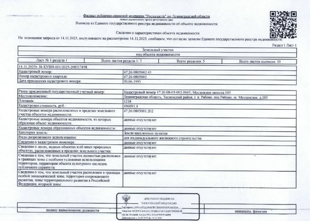 Лот9 Подвергнутое аресту Тосненским РОСП по и/п 407051/25/47035-ИП и принадлежащее должнику Пановой Г.Б. заложенное имущество: земельный участок общ.пл.1218 кв.м. кадастровый 47:26:0805002:43 и жилой дом общ.пл. 50,7 кв.м. кадастровый 47:26:0805001:202, расположенные по адресу: ЛО, Тосненский район, Рябовское г.п., пгт Рябово, ш. Московское, д. 103.