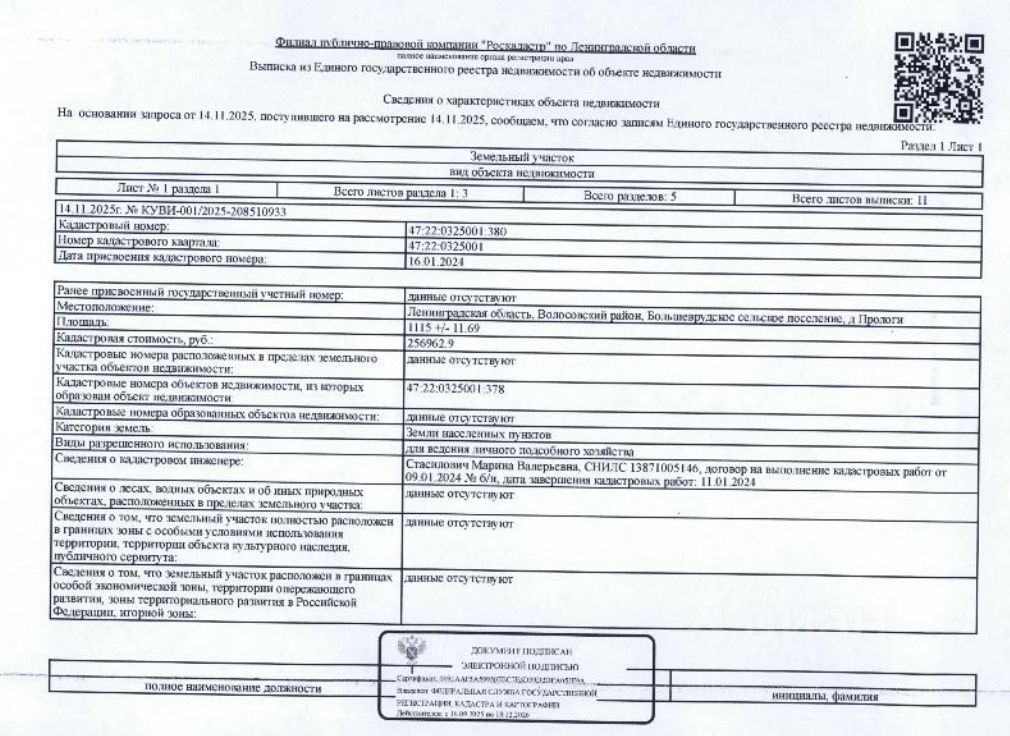Лот11 Подвергнутое аресту Волосовским РОСП по и/п 86404/25/47019-ИП и принадлежащее должнику Соловьеву И.И. заложенное имущество: земельный участок общ.пл. 1115 кв.м. кадастровый 47:22:0325001:380, расположенный по адресу: ЛО, Волосовский район, д. Прологи