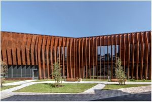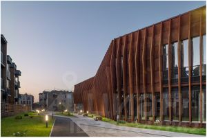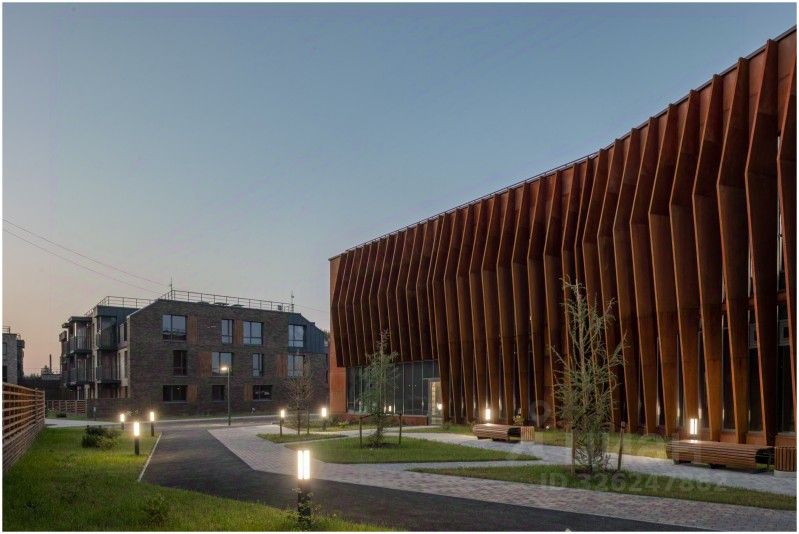 Физкультурно-оздоровительный комплекс спроектирован именитым архитектурным бюро Остоженка. Фасад ФОКа выполнен из редчайшей атмосферостойкой стали Cor-Ten — материала, который отличается высокой прочностью и долговечностью.