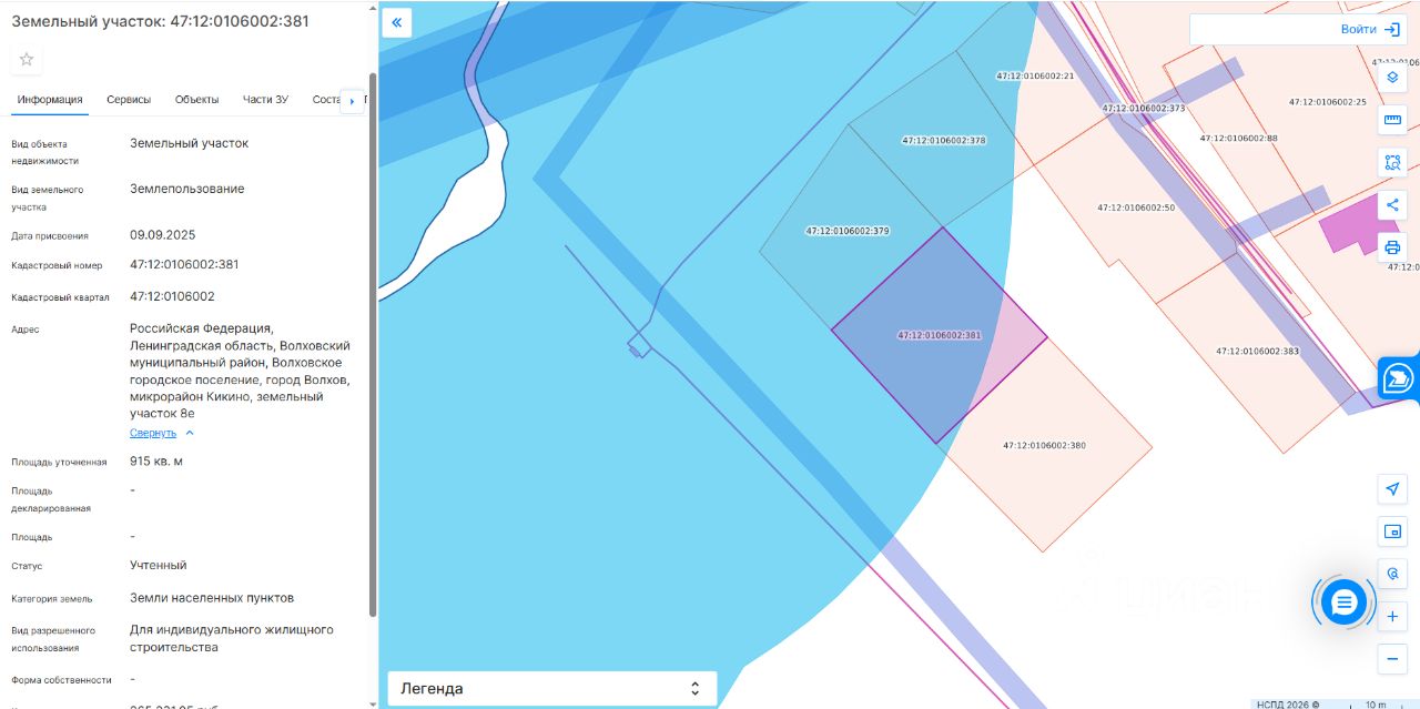 Земельный участок с КН 47:12:0106002:381, расположенный по адресу: Ленинградская область, Волховский муниципальный район,г. Волхов, микрорайон Кикино, земельный участок 8е площадью 915 кв.м, разрешенное использование - для индивидуального жилищного строительства.