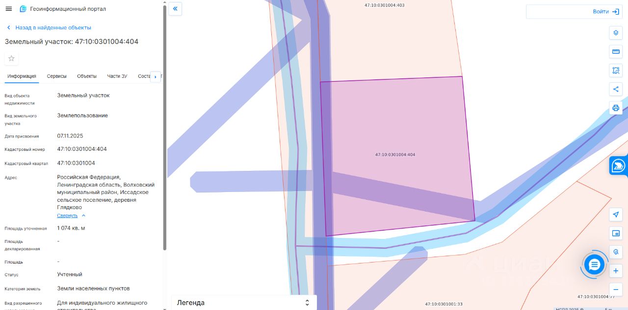 Земельный участок с КН 47:10:0301004:404, расположенный по адресу: Ленинградская область, Волховский муниципальный район, Иссадское сельское поселение, дер. Глядково площадью 1074 кв.м, разрешенное использование - для индивидуального жилищного строительства.