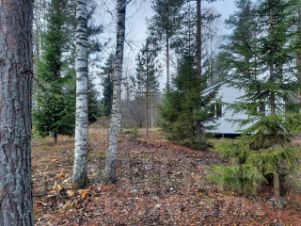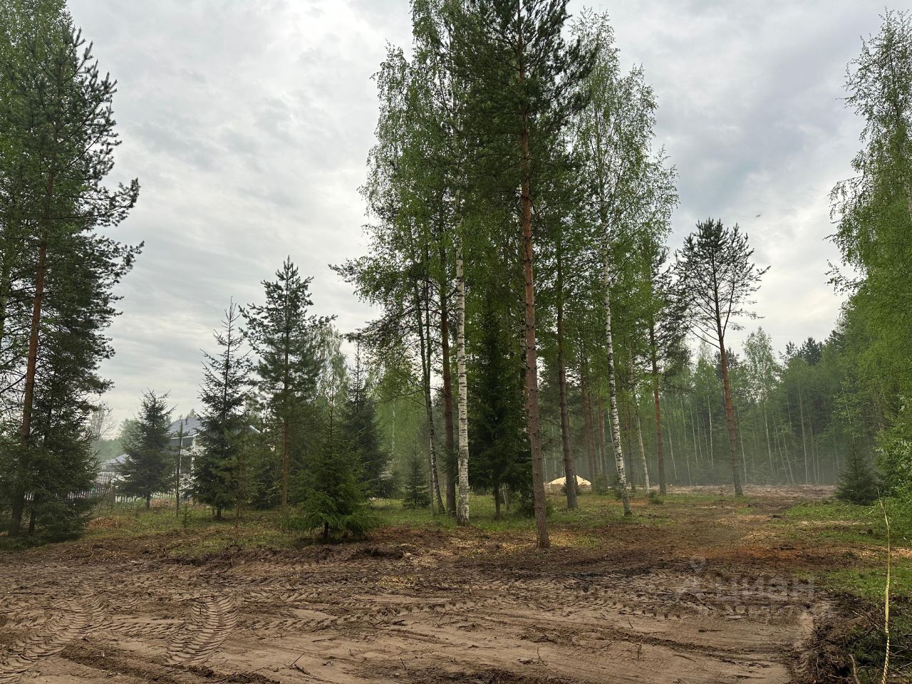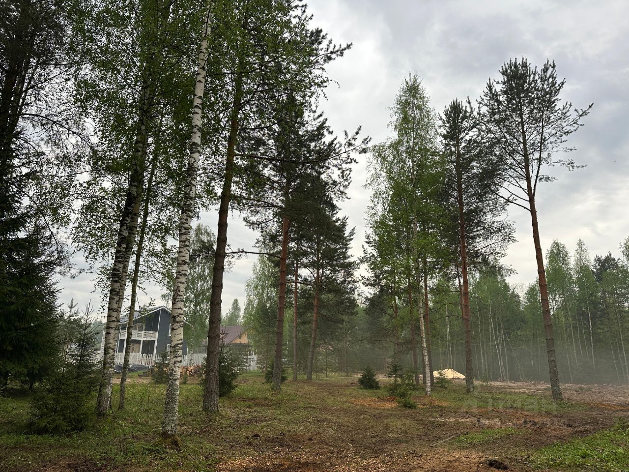 Участок ровный и сухой, окруженный величественными соснами и стройными березами, создающими атмосферу спокойствия и уединения.