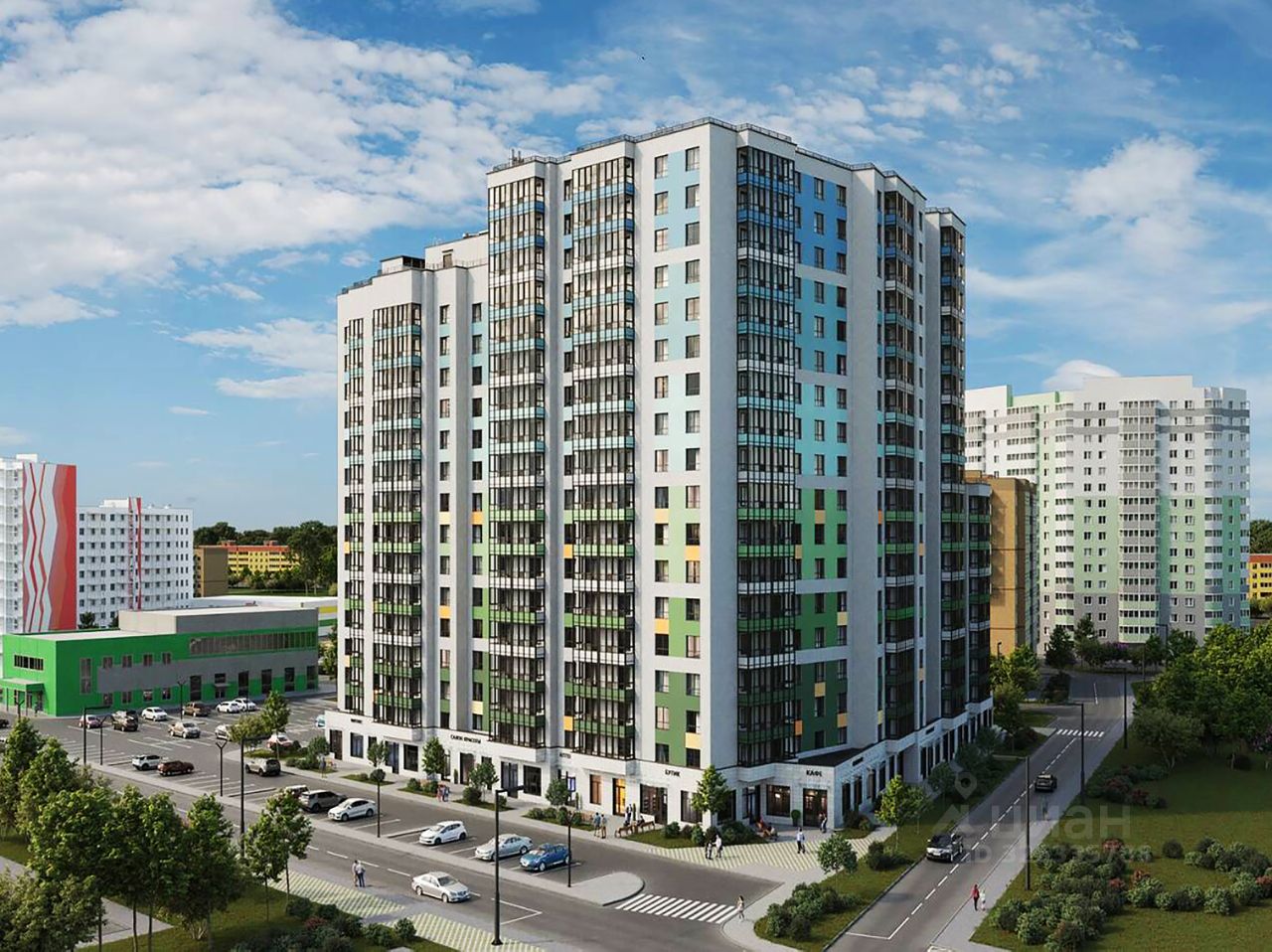 Большой многоэтажный современный жилой комплекс;