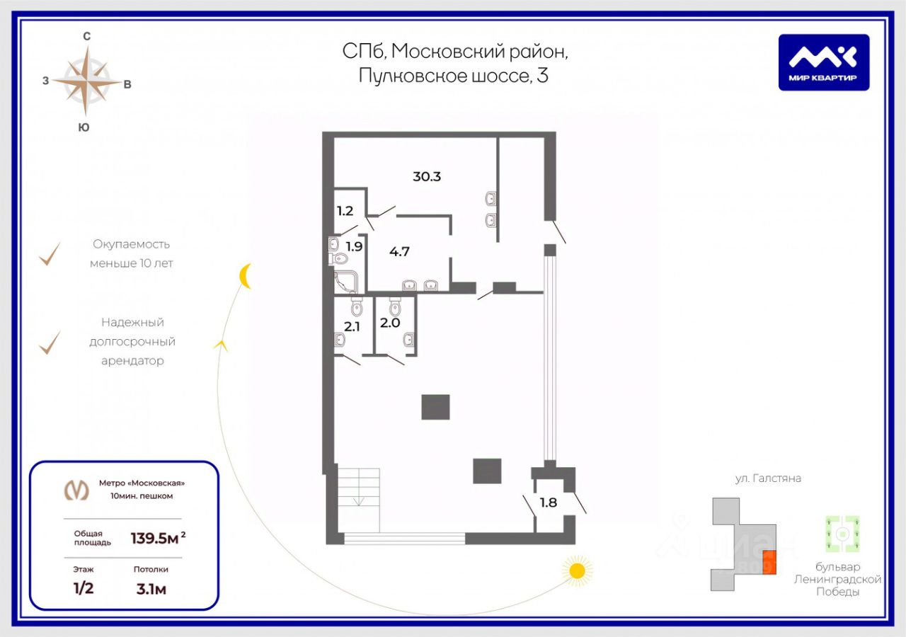 Высота потолка: 3,1 м