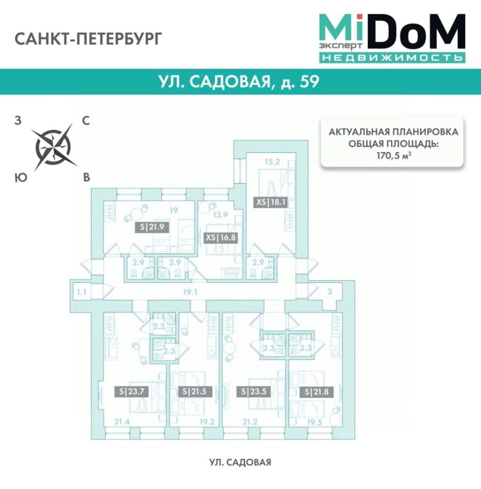 3 жилых помещения (2 на втором этаже 170,5 м.кв. и 60 м.кв., 1 на третьем этаже 156 м.кв.), у каждого свой кадастровый номер. С 3-мя входами (Красивая парадная лестница с Садовой ул., +2 входа с Садовой ул. (отдельная лестница отеля + жилая парадная).