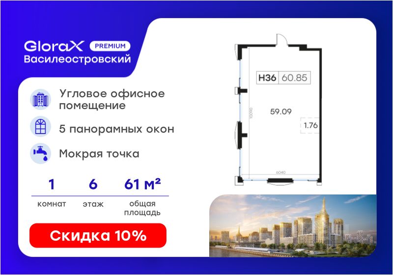 Продается офисное помещение - 60,85 кв.м. в премиальном проекте GloraX Premium Василеостровский.
