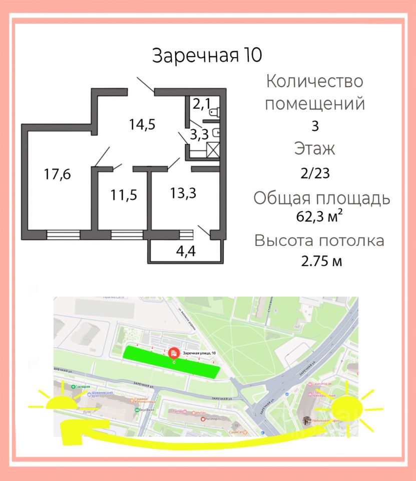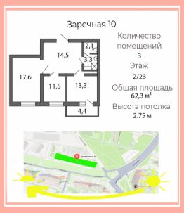 В 10 мин пешком от метро Парнас, по адресу: Заречная ул., д. 10, предлагается в продажу нежилое помещение площадью 62,3 кв м. Свободного назначения.