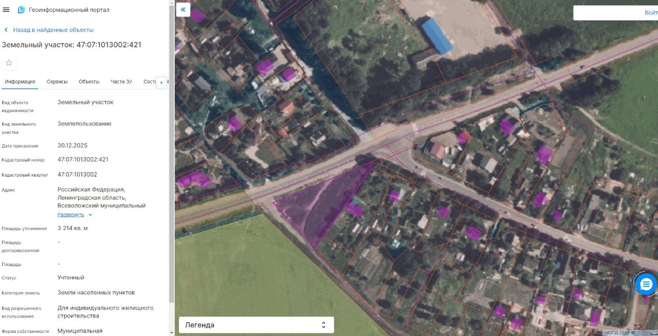 Земельный участок из земель, находящихся в собственности Колтушского городского поселения, площадью 3214 кв.м, кадастровый номер: 47:07:1013002:421, местоположение: Российская Федерация, Ленинградская область, Всеволожский муниципальный район, Колтушское городское поселение, д. Новая Пустошь, ул. Полевая, з/у 1А. Категория земель: земли населенных пунктов; Разрешенное использование: для индивидуального жилищного строительства; Ограничения (обременения): в соответствии со сведениями Единого государственного реестра недвижимости. Описание земельного участка - границы земельного участка установлены в соответствии с требованиями земельного законодательства.