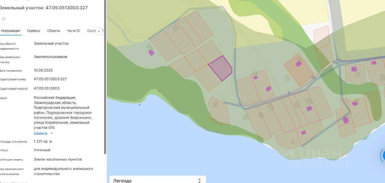 Земельный участок из земель населенных пунктов, с кадастровым номером 47:05:0513003:327, площадью 1221 кв.м. расположенный по адресу: Ленинградская область, Подпорожский муниципальный район, Подпорожское городское поселение, деревня Хевроньино, улица Корабельная, земельный участок 61б, с видом разрешенного использования: для индивидуального жилищного строительства.