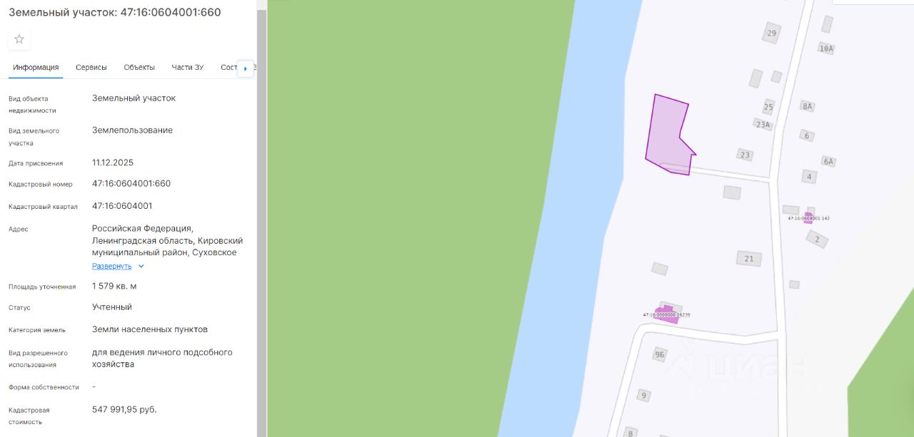 Площадью 1579 кв.м., кадастровый номер 47:16:0604001:660, разрешенное использование: для ведения личного подсобного хозяйства.