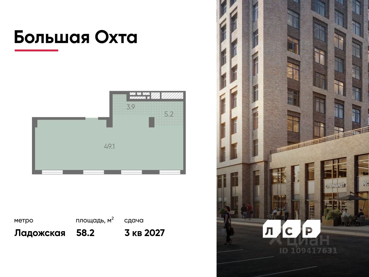 Продается помещение свободного назначения 58.20 кв. м в жилом комплексе бизнес-класса "Большая Охта" в Красногвардейском районе между улицами Якорной и Партизанской, в пяти минутах езды от Большеохтинского моста.