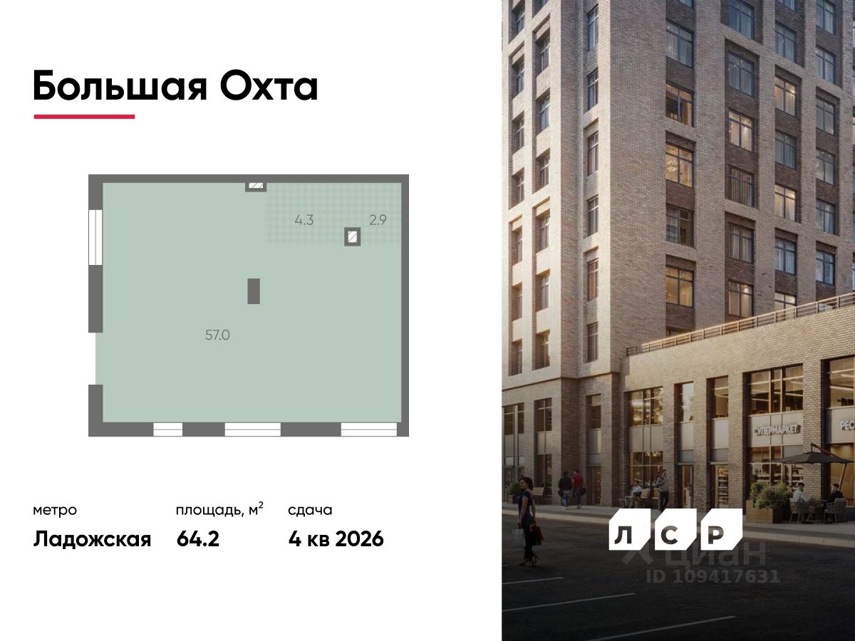 Продается помещение свободного назначения 64.20 кв. м в жилом комплексе бизнес-класса "Большая Охта" в Красногвардейском районе между улицами Якорной и Партизанской, в пяти минутах езды от Большеохтинского моста.