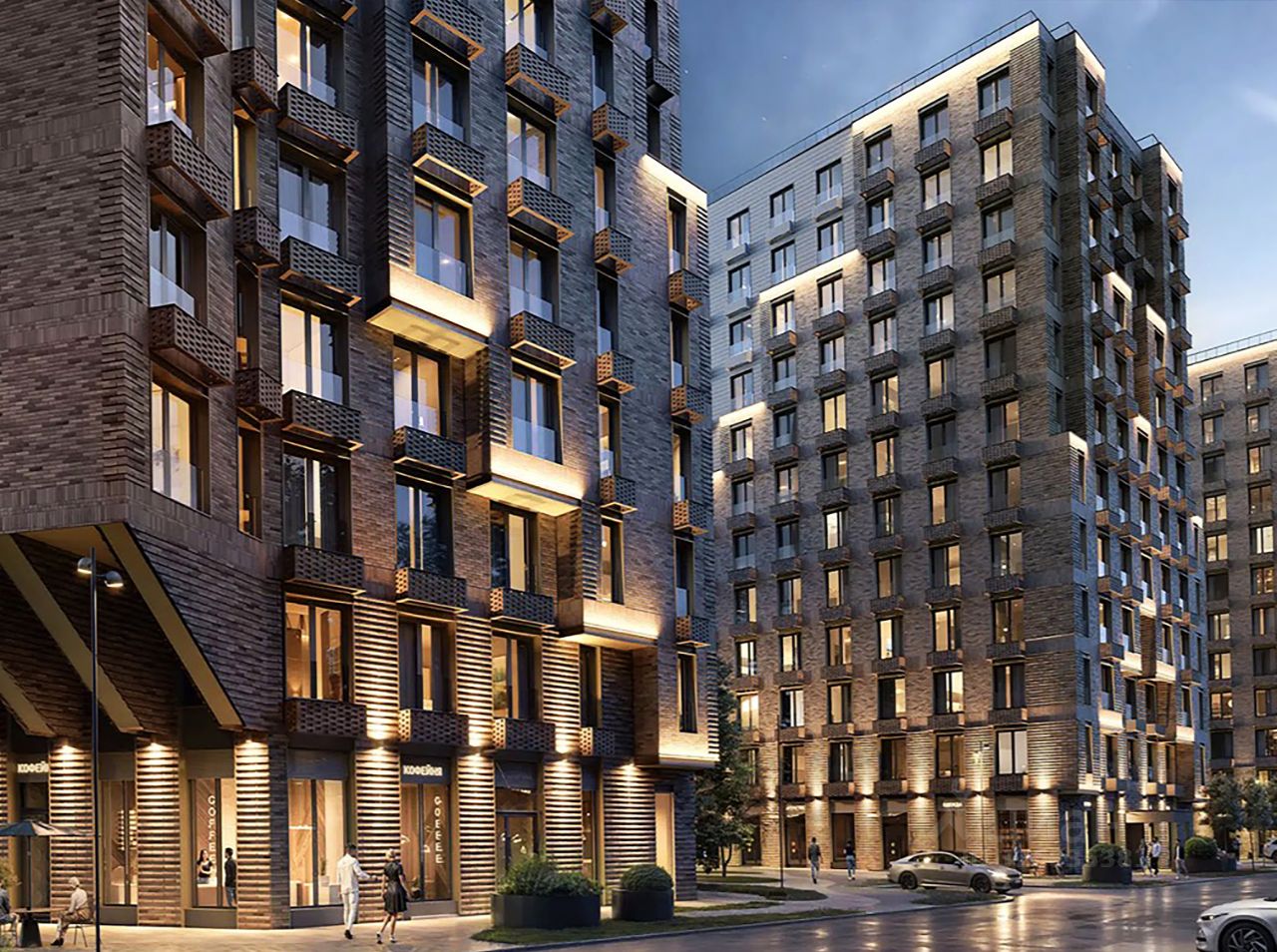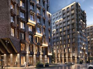 Большой многоэтажный современный жилой комплекс;