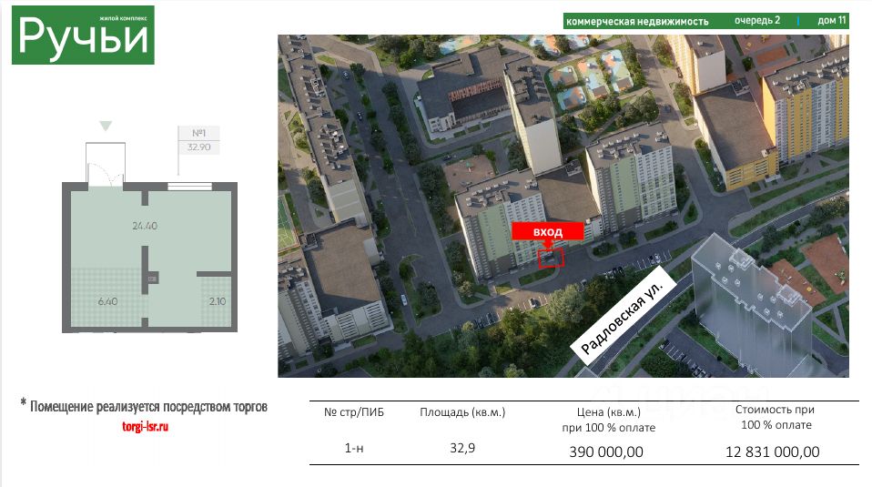 Продаётся коммерческое помещение площадью 32,9. кв. м. в новостройке ЖК "Ручьи" дом 11 . Способы оплаты и более подробная информация по телефону.