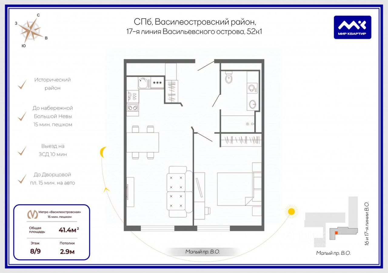 Пешая доступность до основных достопримечательностей города: Кунсткамера, Петропавловская Крепость, Эрмитаж.