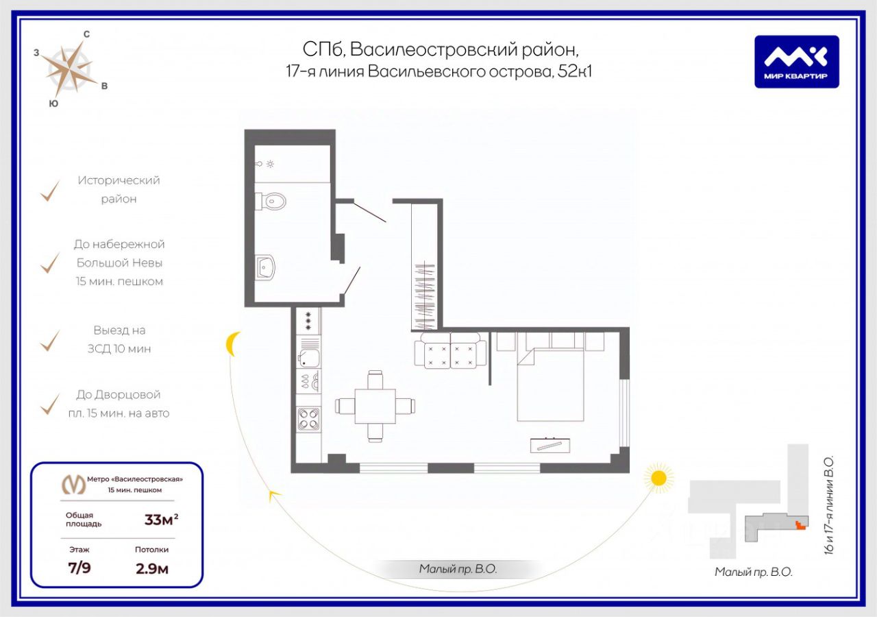 Пешая доступность до основных достопримечательностей города: Кунсткамера, Петропавловская Крепость, Эрмитаж.