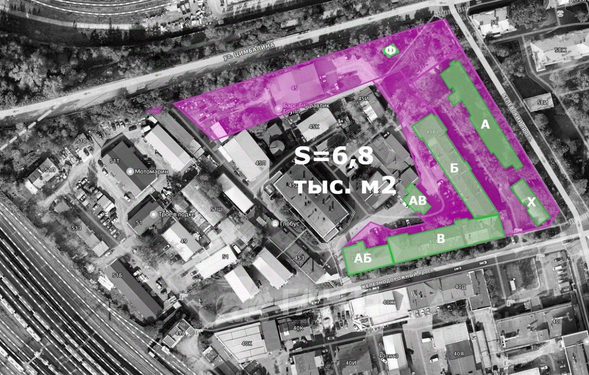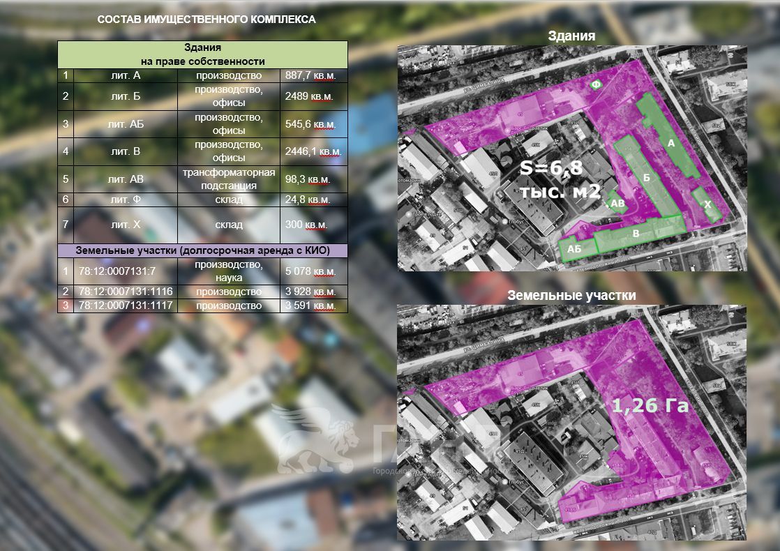• Здание Лит. В (производство, коворкинг, лаборатория): 2 446,1 м². Многоэтажное. Возможно использование: бизнес-центр, гостиница, производство.