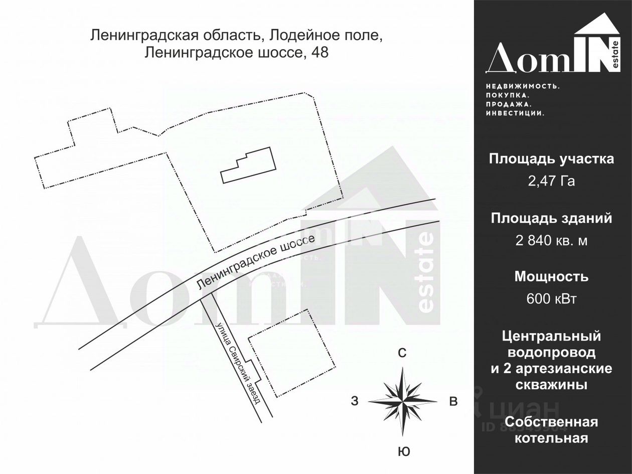 Арт. 129994947 В продаже ЗЕМЕЛЬНЫЙ УЧАСТОК 2.47 Га с комплексом зданий ПРОИЗВОДСТВЕННОГО назначения и готовыми инженерными мощностями в г.ЛОДЕЙНОЕ ПОЛЕ Ленинградской области.