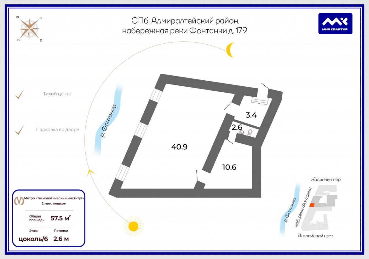 Помещение находится в цоколе статного здания на набережной реки Фонтанки и имеет отдельный вход. Площадь 57,5м, 3 окна, заглубление 1,2м. Идеально подойдёт под офис, магазин, сервисный центр и т.д.