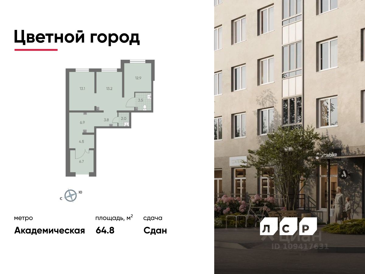Продается помещение свободного назначения 64.80 кв. м в жилом комплексе комфорт-класса "Цветной город" в Красногвардейском районе.