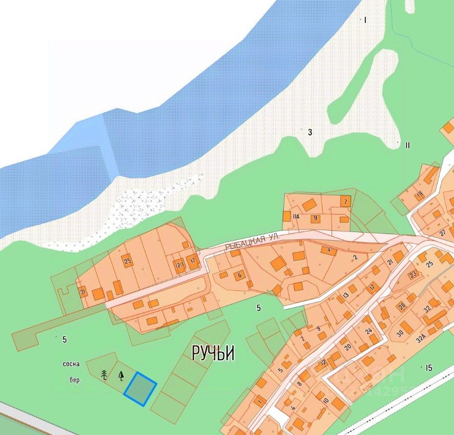 Земельный участок с кадастровым номером 47:15:0106003:986 площадью 1400 кв.м, Российская Федерация, Ленинградская область, Сосновоборский городской округ, г.Сосновый Бор, ул.Рыбацкая, земельный участок 34, для индивидуального жилищного строительства код 2.1.