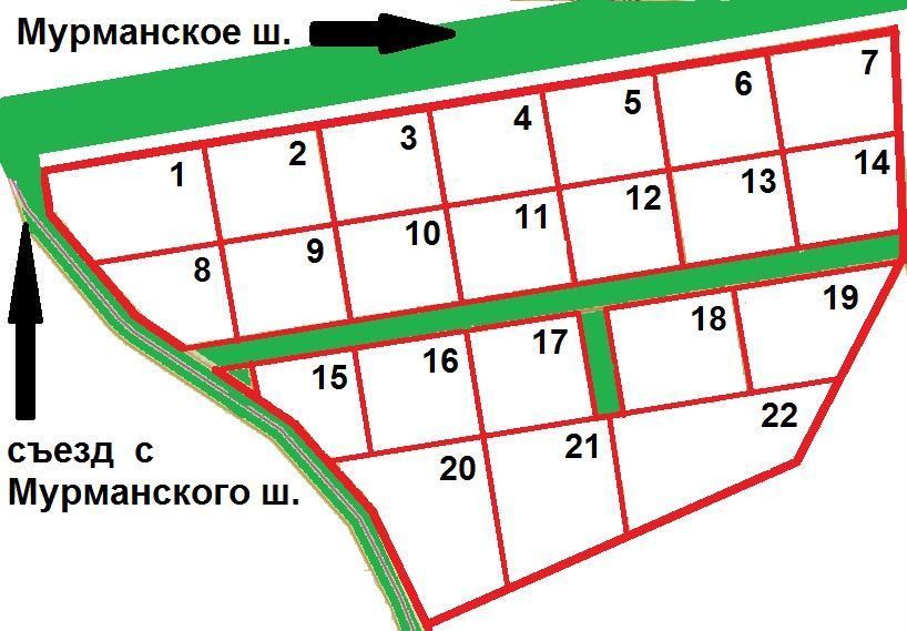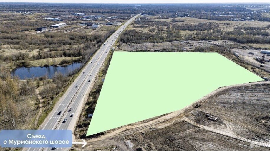 Съезд с Мурманского шоссе. Участки идеально просматриваются с трассы.