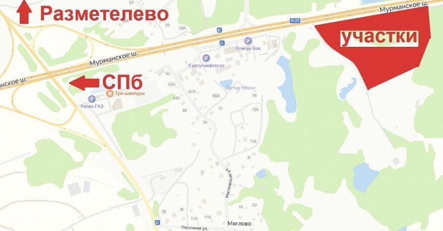 От Собственника! Земельные участки площадью от 20 соток на 24-ом километре трассы Р-21 Кола (Мурманское шоссе). 10 км. От развязки Мурманского ш. И Кад Санкт-Петербурга; 25км. От развязки Кад и трассы М-10 (Московское шоссе); 28 км. От развязки Кад и платной трассы М-11 Нева. По действующим Пзз относится к территориальной зоне ТП 1.1. Имеет 21+4 вида разрешенного использования, среди них: Производственная деятельность (код 6.0); Заправка транспортных средств (код 4.9.1.1); Склад (код 6.9); Магазины (код 4.4); Общественное питание (код 4.6). Отсутствуют Придорожные Ограничения! Съезд с Мурманского шоссе. Участки идеально просматриваются с трассы. Дополнительный инфраструктурный сбор за возможность подключения к сетям электроснабжения и газоснабжения. Расположен в активно развивающейся промышленной зоне, в непосредственном окружении работающих и строящихся предприятий, цехов и складов. Недалеко от населенного пункта Мяглово.