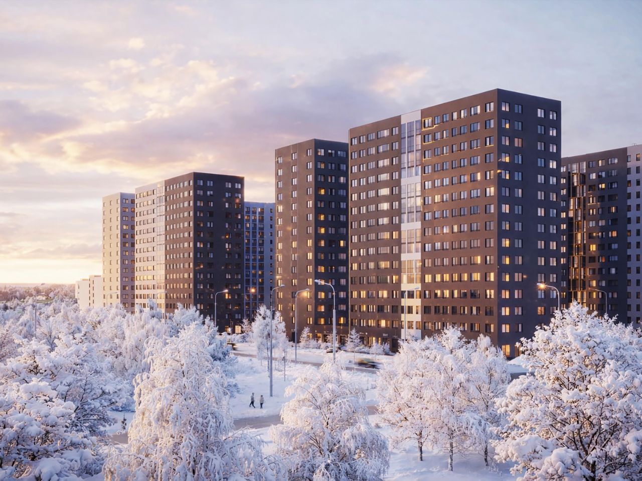 Комплекс включает в себя 5 жилых кварталов. Высота домов составляет 14-16 этажей. Входные парадные расположены на уровне земли, без ступеней и пандусов и двумя входами: со двора и улицы.