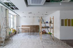 Финальная стадия отделки: установлена новая входная дверь, уложена плитка по всей поверхности пола и на стенах в рабочей зоне кухни и мойки, стены подготовлены под покраску, санузлы для посетителей и персонала. Частично установлены двери.