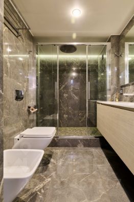 Санузел: Приравнен к стандартам премиальных отелей (5 Звёзд). Стены и пол Итальянский керамогранит, подвесная сантехника от Duravit или Villeroy & Boch, смесители скрытого монтажа.