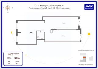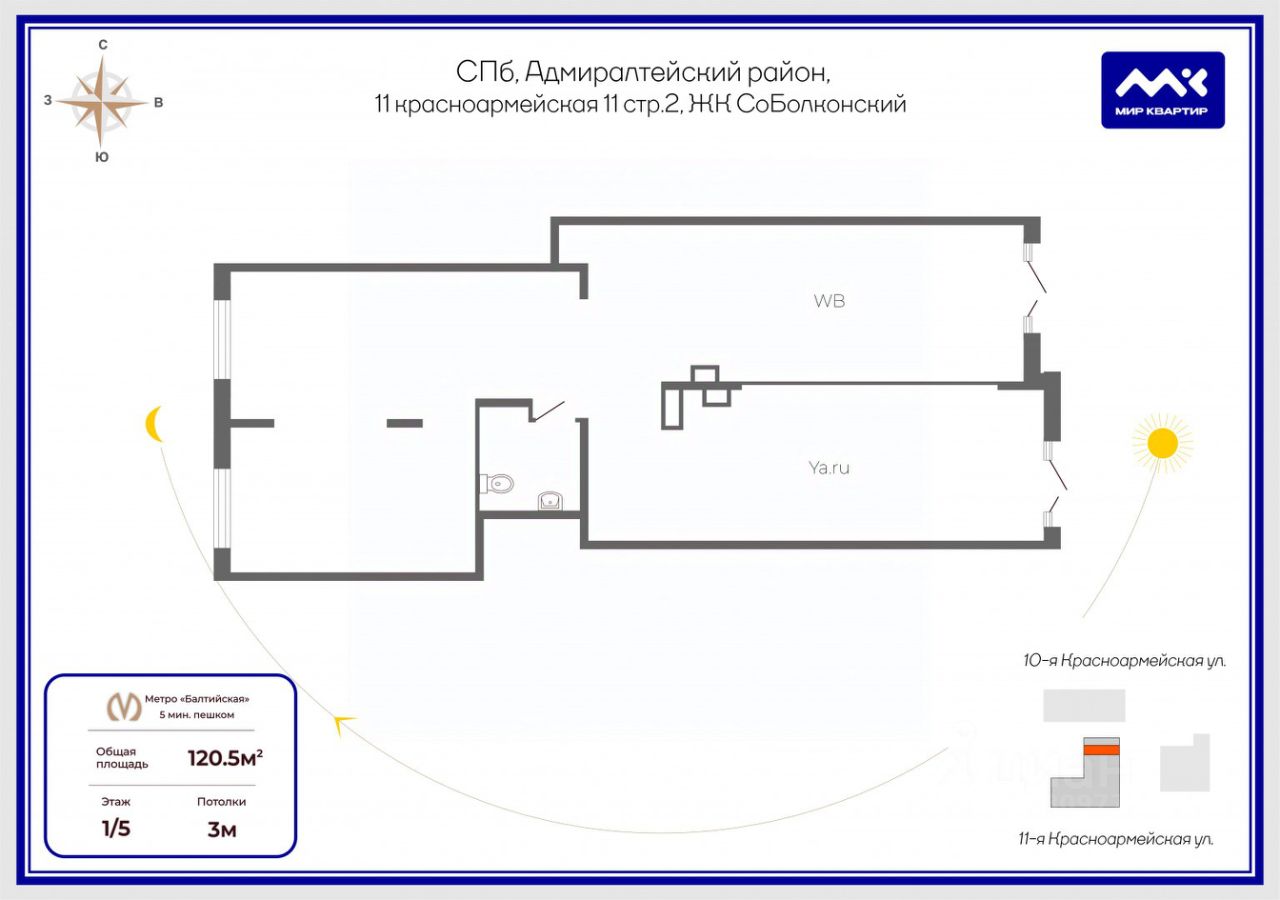 Район: Адмиралтейский. Адрес: 11-я Красноармейская улица. Метро: "Балтийская" — 5 минут пешком. "Технологический институт" — 10 минут пешком. Транспортная развязка: 3 минуты до набережной Обводного канала. Дом: От известного застройщика (RBI).