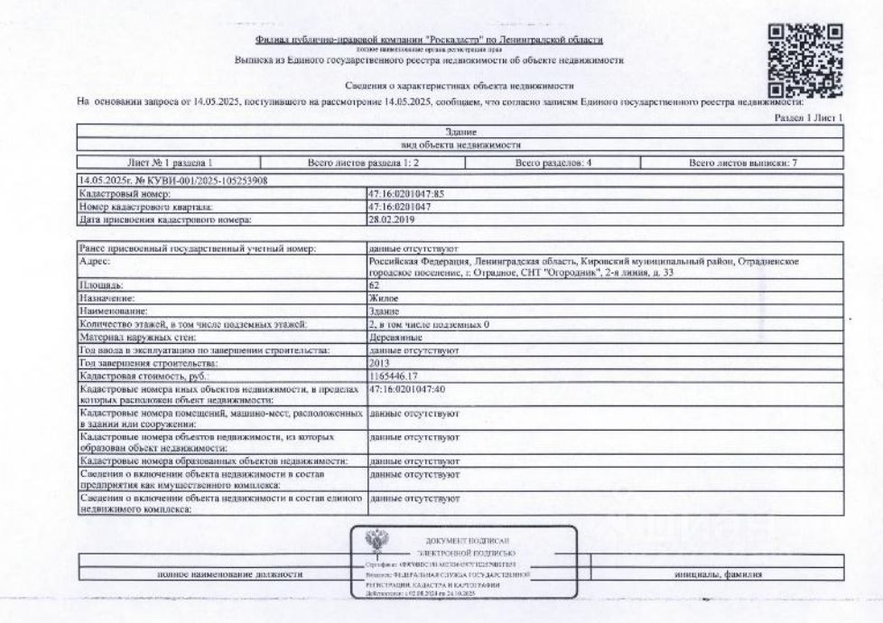 Лот5(повторные) Подвергнутое аресту Кировским РОСП по и/п 158985/25/47026-ИП и принадлежащее должнику Цыганий А.В., арестованное имущество: Земельный участок общ. пл. 781 кв.м., кадастровый 47:16:0201047:40 и расположенный на нем жилой дом общ. пл. 62 кв.м., кадастровый 47:16:0201047:85, по адресу: Ленинградская область, Кировский мун. район, Отрадненское г.п., Отрадное, СНТ "Огородник", 2-я линия, д. 33.