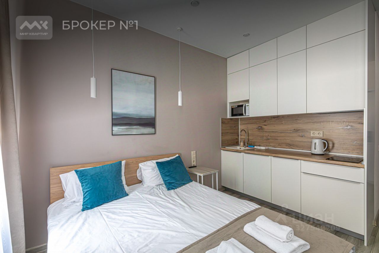 Продуманное пространство: Каждый метр студии использован с умом. Здесь есть все для жизни или отдыха вдвоем: удобная спальня, мини-кухня, качественная мебель и современная техника. Мягкие, пастельные тона в интерьере создают ощущение домашнего уюта и способствуют расслаблению.