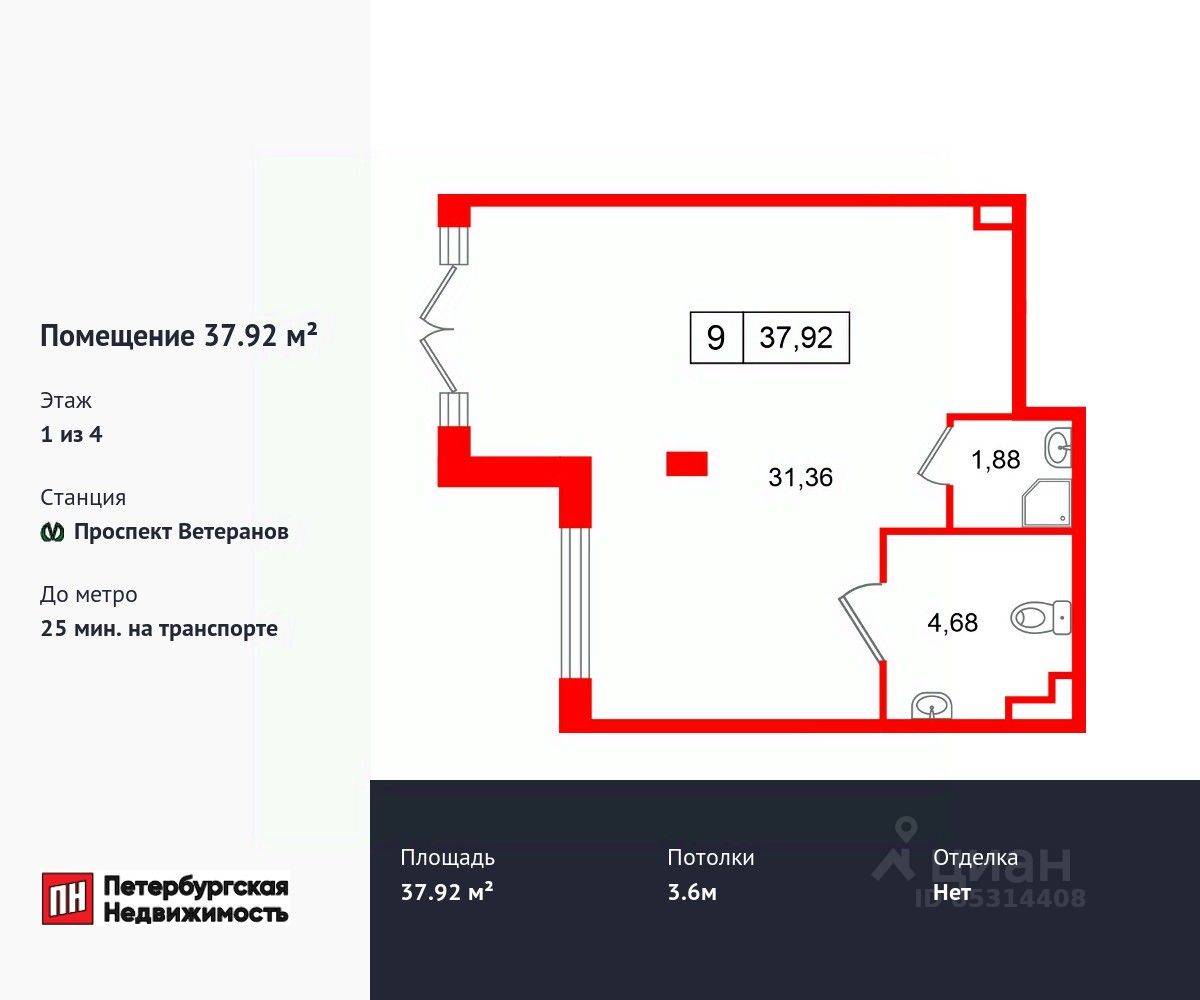Продается помещение в ЖК ЖК "Дворцовый фасад площадью 37.92 м2. Помещение расположено рядом с метро Проспект Ветеранов. Расстояние до метро 25 Мин.на транспорте. Корпус сдается в 2026. Высота потолка 3.6 м. Без отделки.