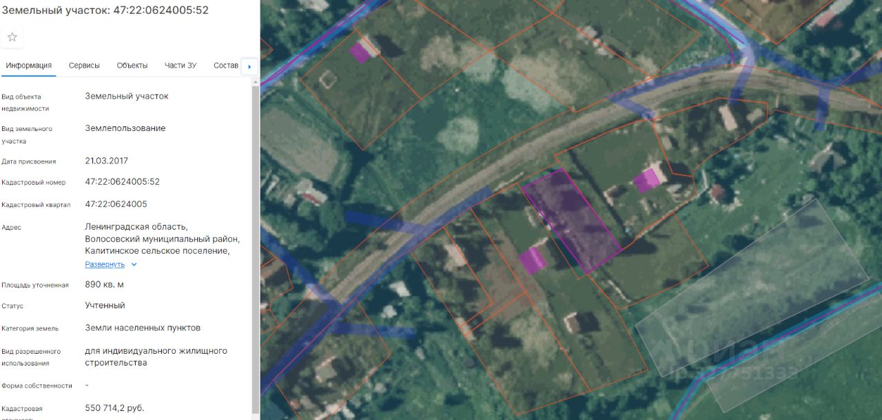 Земельный участок с кадастровым номером 47:22:0624005:52, площадью 890 кв.м.