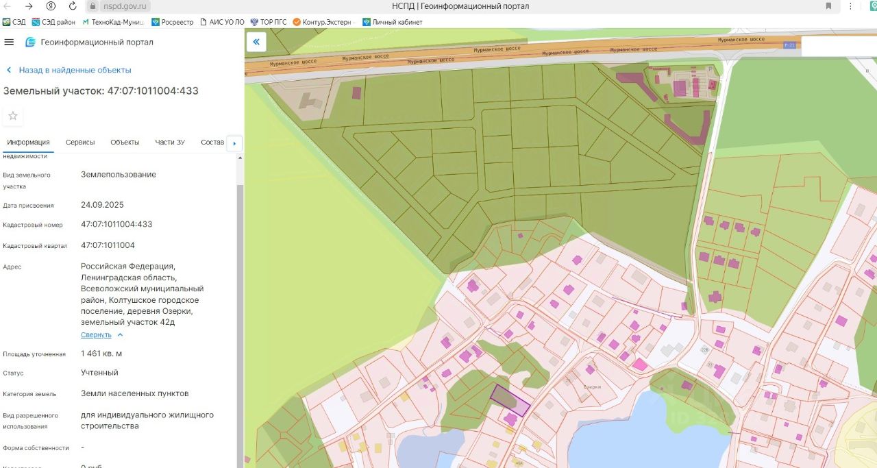 Земельный участок из земель, находящихся в собственности Колтушского городского поселения, площадью 1461 кв.м, кадастровый номер: 47:07:1011004:433, местоположение: Российская Федерация, Ленинградская область, Всеволожский муниципальный район, Колтушское городское поселение, д. Озерки, з/у 42д. Категория земель: земли населенных пунктов; Разрешенное использование: для индивидуального жилищного строительства; Ограничения (обременения): в соответствии со сведениями Единого государственного реестра недвижимости. На Участке расположено здание оставшаяся часть 5%. Описание земельного участка - границы земельного участка установлены в соответствии с требованиями земельного законодательства.