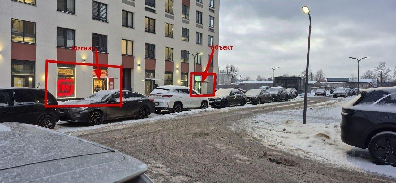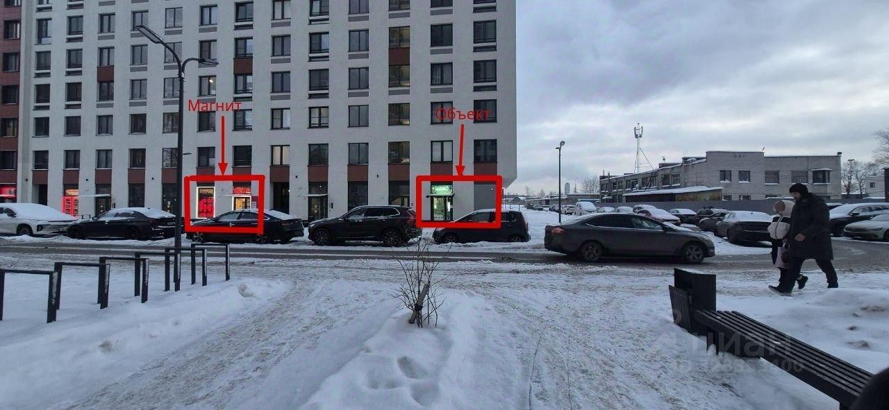 Сильное соседство (якоря): Рядом расположены Магнит и магазин хозтоваров, которые ежедневно генерируют большой поток покупателей. Также есть кафе — это увеличивает время пребывания людей в зоне.