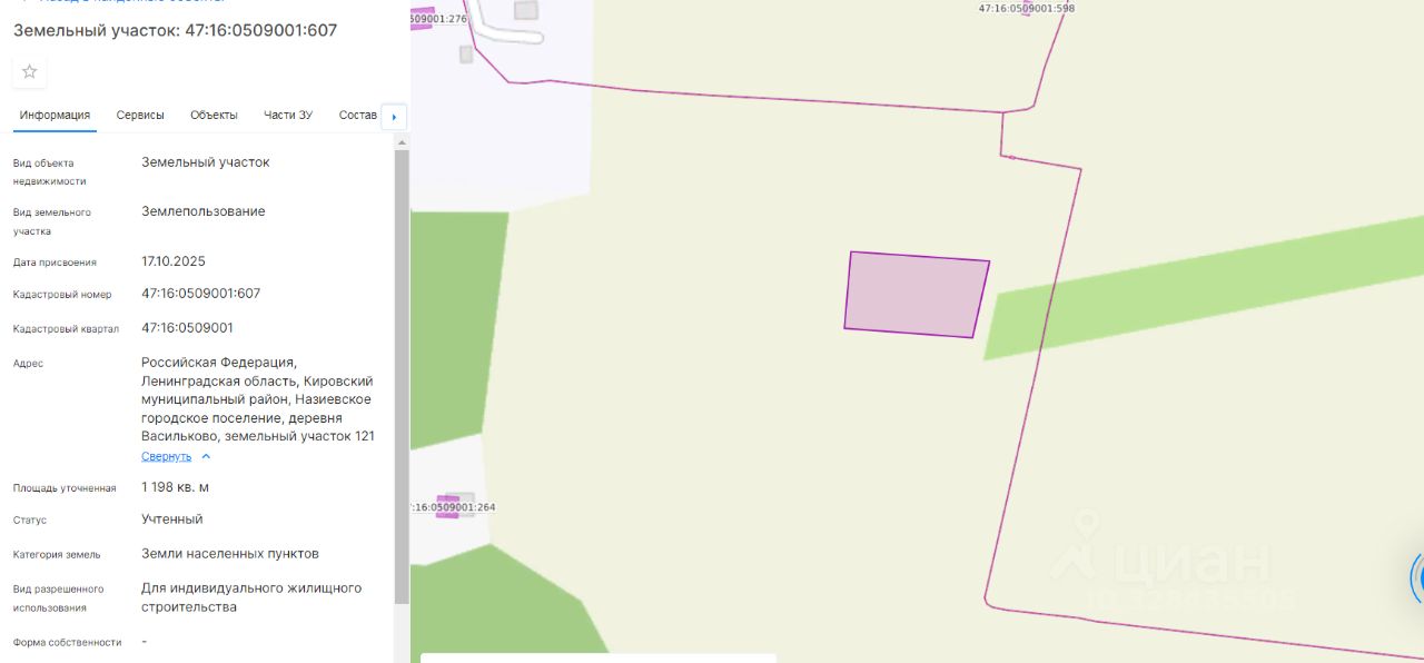Площадью 1198 кв.м., кадастровый номер 47:16:0509001:607.