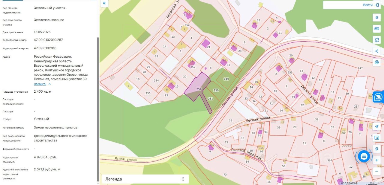 Земельный участок из земель, государственная собственность на которые не разграничена, площадью 2400 кв.м, кадастровый номер: 47:09:0102010:257, местоположение: Российская Федерация Ленинградская область, Всеволожский муниципальный район, Колтушское городское поселение, д. Орово, ул. Песочная, з/у 30. Категория земель: земли населенных пунктов; Разрешенное использование: для индивидуального жилищного строительства; Описание земельного участка - границы земельного участка установлены в соответствии с требованиями земельного законодательства.