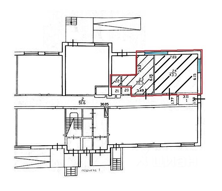 Состоит из двух помещений 43,3 кв.м. и 22,8 кв.м. с отдельными входами.