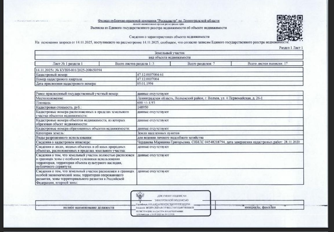 Подвергнутое аресту принадлежащее должнику Дутовой О.В. имущество: земельный участок общ.пл. 600 кв.м. кадастровый 47:12:0107004:61 категория земель - земли населенных пунктов, вид разрешенного использования для ведения личного подсобного хозяйства, расположенный по адресу: Ленинградская область, Волховский район, г. Волхов, ул. 4 Первомайская, д. 26-1. Обременение: запреты регистрационных действий ФССП, ограничения прав на земельный участок, предусмотренные ст. 56 Земельного кодекса РФ.